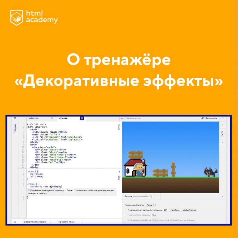 Это тренажёр для более продвинутых студентов, понимающих основы HTML и CSS. В нём вы научитесь оживлять элементы интерфейса с помощью анимации и трансформации.