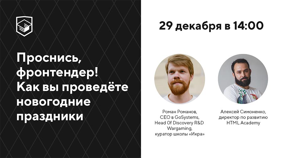 29-го декабря в 14:00 на лайве вас ждёт увлекательная беседа Лёши Симоненко — директора по развитию HTML Academy и Ромы Романова — CEO в GoSystems, руководителя отдела Discovery R&D Wargaming и куратора школы Икра.