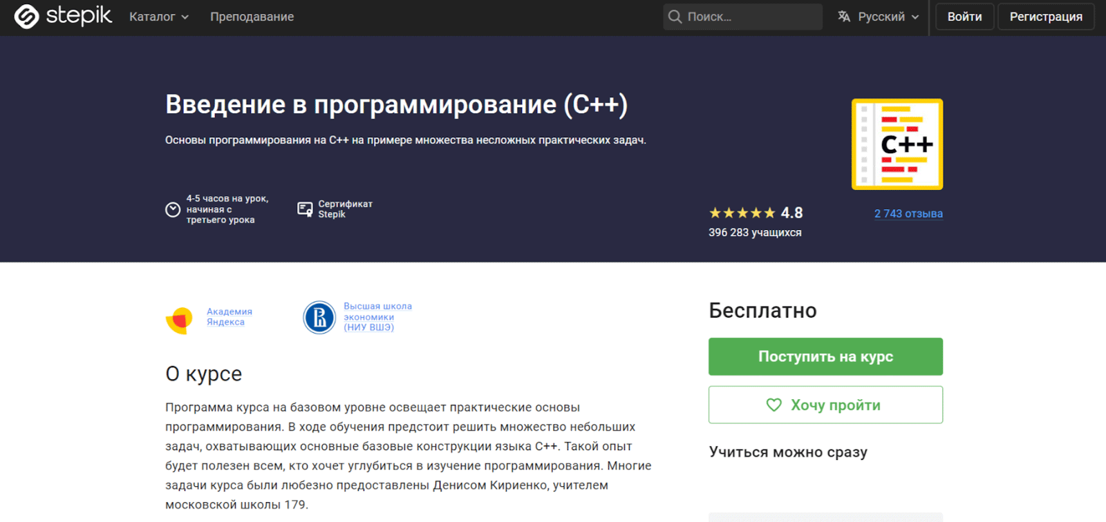 • Чему научитесь: программа включает минимум теории по основам программирования и C++, но вас ожидает множество мелких практических задач, разработанных школьным учителем и куратором академических программ Yandex. Выпускники получают электронный сертификат.