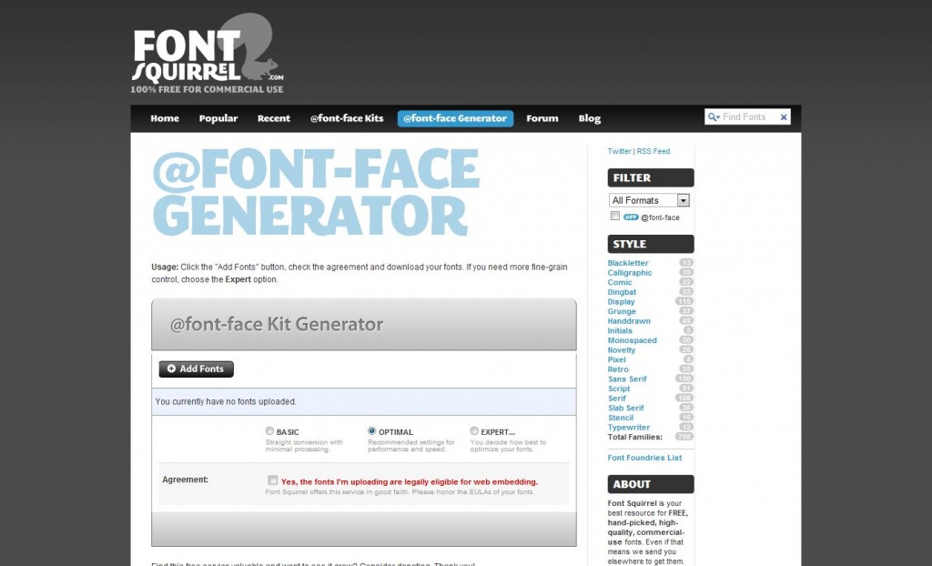 В Интернете есть два наиболее удобных сервиса встраивания шрифтов в страницу: хвалёный Google WebFonts (о котором уже рассказано немало), а также Font Squirrel @font-face Generator, о котором, собственно, и пойдёт речь в этой статье.
