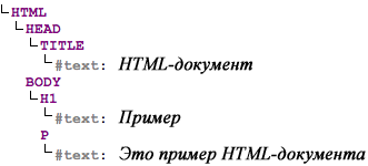 В отличие от предыдущих версий HTML и XHTML, которые определены с позиции их синтаксиса, HTML5 в настоящее время определяется в терминах объектной модели документа (DOM) —дерево представления, которое используют браузеры для отображения документа. К примеру, рассмотрим очень простой документ, состоящий из названия, заголовка и абзаца. Дерево DOM может выглядеть примерно так.