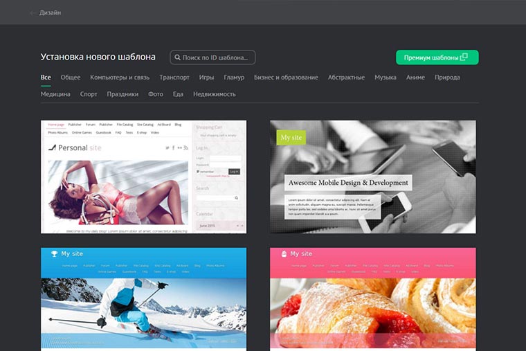 • Богатый набор встроенных шаблонов различного уровня исполнения. Все они бесплатные. Среди них есть и адаптивные. Для тех, кто желает получить яркий и уникальный дизайн, существует фирменный магазин премиум-шаблонов. 10-15$ – и ваш сайт будет одет по последней моде;
