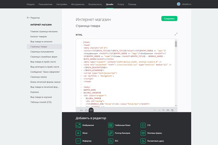 Простор по работе с шаблонами здесь ничем не ограничен: можете купить премиум-дизайн, создать с нуля свой, отредактировать готовый, экспортировать участки кода. В общем, полный карт-бланш. Было бы умение да фантазия.