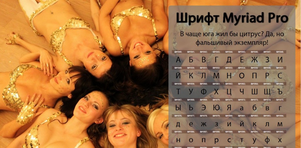 Предположим, что дизайнер использовал в своём макете очень модный, самый популярный вывесочно-заголовочный шрифт MyriadPro от Adobe. В Google WebFonts его нет, хотя бы потому, что Adobe не сделала его свободным.