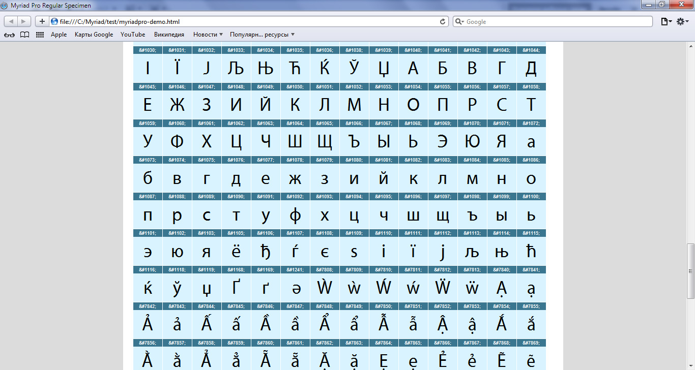 Проверяем во всех современных браузерах: Chrome, Firefox, Internet Explorer 9, Opera и Safari. Кириллица есть? Прекрасно.