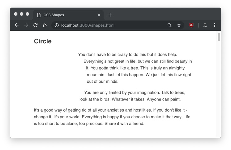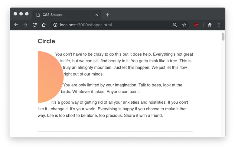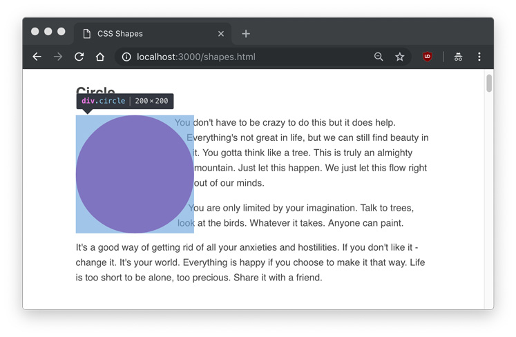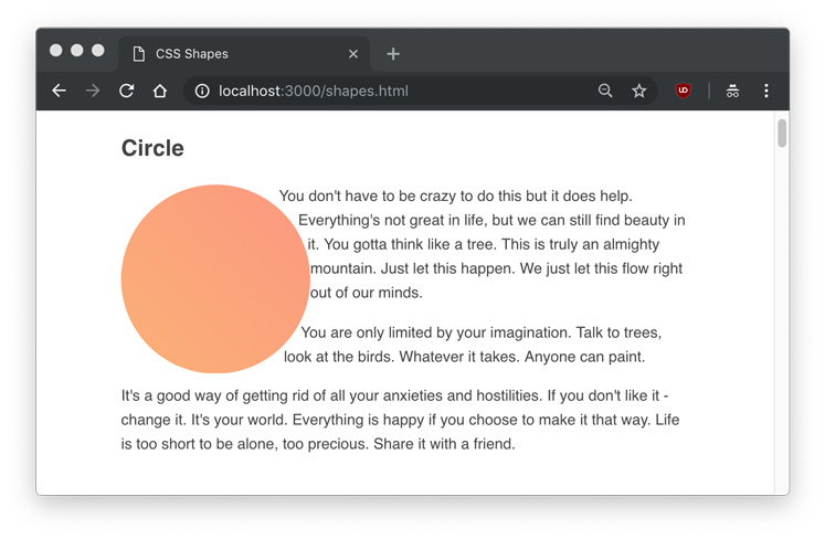 Для нашего класса circle мы добавляем float со значением left, присваиваем ему одинаковую высоту и ширину и устанавливаем значение shape-outside как circle().