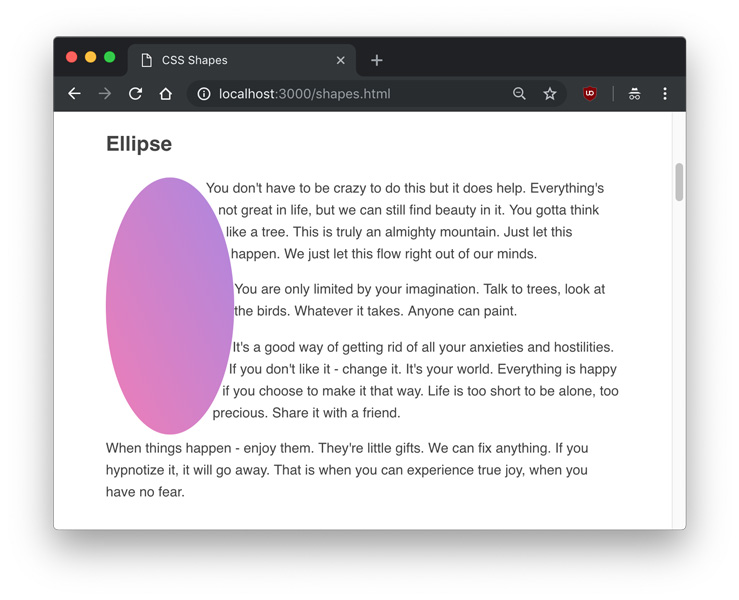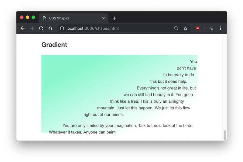 Наконец, в качестве фигуры можно использовать градиенты. Они работают как изображения, и как с изображением, которое мы использовали выше, текст будет обтекать прозрачную часть.