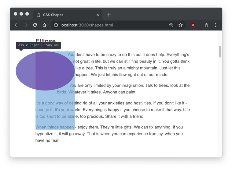 Как видите, текст обтекает по кругу, но в действительности никакой фигуры не видно. Если навести курсор на элемент в Инструментах разработчика, то увидим фактическую фигуру, которая будет установлена.