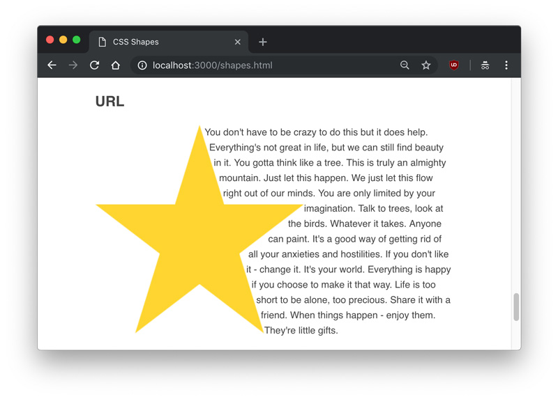 В отличие от других примеров, мы будем использовать тег <img> вместо <div>. На этот раз CSS простой — просто поместите url() в свойство shape-outside, как вы бы это сделали со свойством background-image.