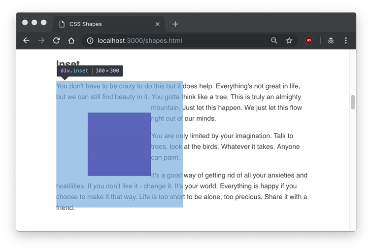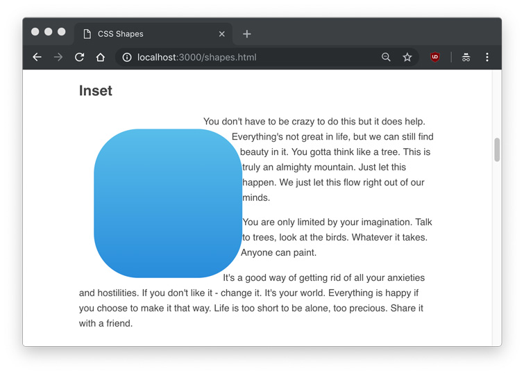 Чтобы добавить свойство shape-outside к элементу, он должен быть обтекаемым, а также у него должна быть установлена высота и ширина. Давайте рассмотрим каждую из четырёх основных фигур и продемонстрируем, как их можно использовать.