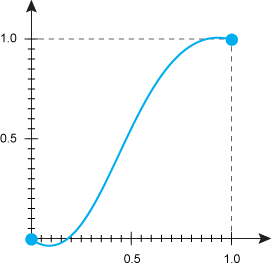transition-timing-function представляет собой математическую функцию, показывающую, как быстро по времени меняется указанное через transition-property значение свойства. Начальная точка имеет координаты 0.0, 0.0, конечная — 1.0, 1.0, при этом функция по оси ординат может превышать эти значения в большую или меньшую сторону (рис. 1).