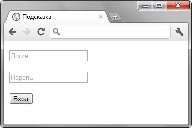 В дизайне часто требуется вставить пояснение к текстовому полю, но не всегда для этого имеется место. Решением в таком случае является добавление подсказывающего текста непосредственно внутрь поля, при получении фокуса исходный текст должен пропадать. Это делается с помощью атрибута placeholder, значением которого служит любой текст. Подсказка делается для полей <input type="text">, <input type="password">, <input type="search">, <input type="email">, <input type="tel">, <input type="url"> и <textarea>, иными словами, везде, где вводится текст.