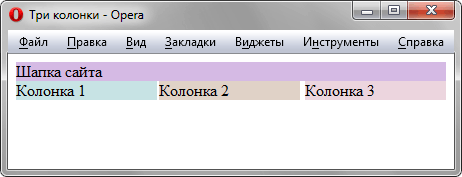 Макет № 4, в котором ширина всех колонок задана в процентах имеет некоторые нюансы. Если требуется одинаковая ширина всех колонок, её можно задать дробно (33.33%), но браузер Opera не умеет работать с дробными значениями процентов, поэтому в нём между колонками появятся «дыры» (рис. 5.18).